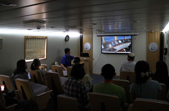 “科學(xué)”號船長隋以勇詳細介紹了“科學(xué)”號的船舶設(shè)計、建造過程以及各項參數(shù)性能。考察團一行參觀了駕駛室、綜合儀器室、實驗室、機艙、絞車艙、作業(yè)甲板等工作場所,以及住房、餐廳、休閑、健身等生活場所,對船舶動力定位、減搖水艙功能和綜合科學(xué)考察能力進行了詳細了解。