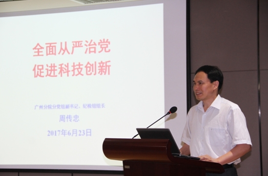 周傳忠以“全面從嚴(yán)治黨 促進(jìn)科技創(chuàng)新”為題,從全面從嚴(yán)治黨新形勢新要求、以全面從嚴(yán)治黨促進(jìn)科技創(chuàng)新和當(dāng)前研究所全面從嚴(yán)治黨任務(wù)三個(gè)方面進(jìn)行了講解。報(bào)告引用了黨和國家領(lǐng)導(dǎo)關(guān)于全面從嚴(yán)治黨的重要論述和要求,從八項(xiàng)規(guī)定、學(xué)習(xí)教育、反腐敗、選人用人、制度建設(shè)、政治巡視、紀(jì)監(jiān)體制改革七個(gè)方面闡述了當(dāng)前全面從嚴(yán)治黨的新形勢。報(bào)告強(qiáng)調(diào),政治紀(jì)律和政治規(guī)矩,是國家科研機(jī)構(gòu)發(fā)揮戰(zhàn)略科技力量的根本保證。每名科技工作者要旗幟鮮明地講政治,時(shí)刻牢記國家戰(zhàn)略科技力量的重要使命,時(shí)刻把國家利益、集體利益置于個(gè)人利益之上,把講規(guī)矩、守紀(jì)律與勇于創(chuàng)新、勇于開拓很好地結(jié)合起來,不辜負(fù)黨、國家和人民的信任與期待。報(bào)告指出,當(dāng)前研究所要深入學(xué)習(xí)六中全會精神、推進(jìn)“兩學(xué)一做”學(xué)習(xí)教育常態(tài)化制度化、把責(zé)任制落到實(shí)處、健全完善規(guī)章制度、做好監(jiān)督執(zhí)紀(jì)問責(zé)等工作,落實(shí)全面從嚴(yán)治黨要求。