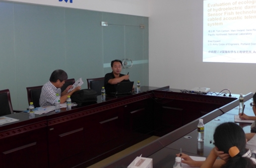 鄧志群領(lǐng)導(dǎo)的團(tuán)隊(duì)近年來(lái)主要開(kāi)展生態(tài)聲學(xué)監(jiān)測(cè)及海洋能等方面的研究,本次訪問(wèn)他做了題為“基于海洋生物警報(bào)系統(tǒng)下的海洋可再生能源保護(hù)”(Marine Animal Alert System to Support Marine Renewable Energy)和“利用聲學(xué)遙感系統(tǒng)來(lái)監(jiān)測(cè)和追蹤三文魚(yú)幼魚(yú)及其他魚(yú)類”(An acoustic telemetry system for detecting and tracking juvenile salmon and other fishes)兩個(gè)報(bào)告,分別介紹了其團(tuán)隊(duì)研發(fā)的小型水聽(tīng)器在魚(yú)類洄游標(biāo)記、監(jiān)測(cè)乃至生態(tài)建模中的系統(tǒng)運(yùn)作原理和成功運(yùn)用案例;針對(duì)潮汐發(fā)電站設(shè)計(jì)研發(fā)出一套運(yùn)用主被動(dòng)聲學(xué)監(jiān)聽(tīng)裝置對(duì)海洋哺乳動(dòng)物進(jìn)行監(jiān)測(cè)和定位的預(yù)警保護(hù)系統(tǒng)(接近觸發(fā)停運(yùn)機(jī)制),從而保護(hù)鯨豚動(dòng)物。