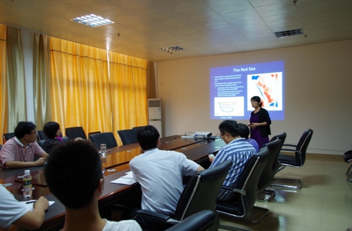 報告中,翟平博士介紹了她的工作內容,包括基于CFCsSF6示蹤物的區域海洋環流反演研究,紅海環流的數值模擬以及CFCsSF6示蹤物的測量等。我所科研人員就紅海海底有無鹽池,研究紅海區域的意義以及示蹤物取樣等問題與翟平博士進行了深入交流。
