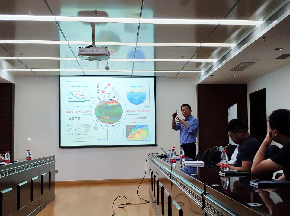 報告中,劉志宇教授首先系統(tǒng)介紹了如何量化海洋中的湍流混合。他以北太平洋低緯度西邊界流的溫躍層混合為例,展示了該區(qū)域湍流混合觀測的結(jié)果,該觀測結(jié)果與理論結(jié)果一致,即低緯度的混合量級小,而以往利用細(xì)尺度參數(shù)化方法計算得到的低緯度湍流混合量級過大。最后他給大家講解了一些波浪-湍流分解的方法,以便更好的量化湍流混合。劉志宇教授的報告深入淺出,引發(fā)所內(nèi)不同學(xué)科科研人員極大的興趣,會后大家進(jìn)行了熱烈的討論。