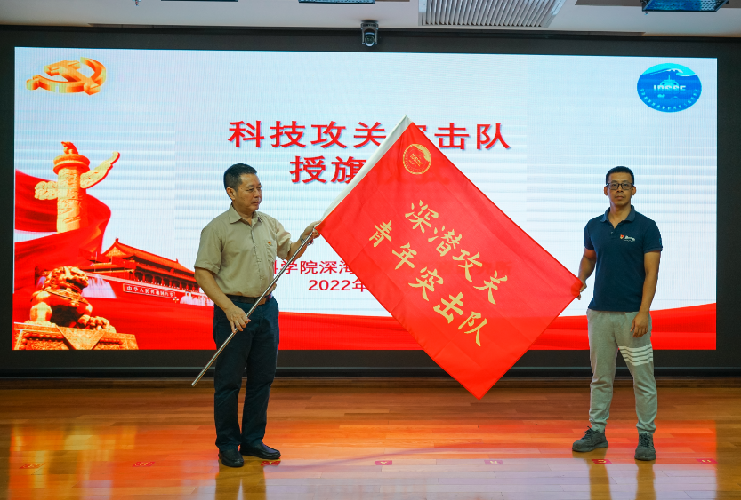 會上還舉行了科技攻關(guān)突擊隊授旗儀式。陽寧為深海基站攻關(guān)突擊隊、海底移動作業(yè)平臺攻關(guān)突擊隊、深潛攻關(guān)青年突擊隊、深淵科學(xué)攻關(guān)突擊隊授旗。?