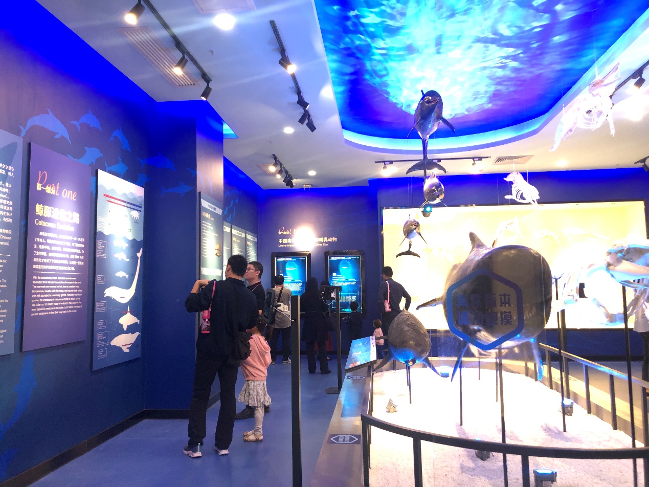 開放活動位于深海所主樓一樓展區,包括海洋生態科普展,鯨豚標本館以及深海科考紀實片觀影區三個展區。在海洋生態科普展區,通過“初見”“窘境”展板,循序漸進的介紹人類目前已知的海洋生物以及他們生存所面臨的捕撈、屠戮及白色污染等問題,最后,通過“攜手”展區,介紹三亞現有的海洋保護組織,呼吁全民參與,共同努力,攜手保護海洋生物,保護海洋生態環境。在該展區還首次通過全息影像技術向觀眾生動的展示了來自8000米水深的大型生物——深海獅子魚,并通過滾動播放旁白的方式科普獲取獅子魚樣品數據的航次及深淵著陸器等詳細信息,讓大家對深海深淵科考有了更加深入的了解。鯨豚標本館本次共展出8個物種22副標本,利用鯨豚聲音模擬演示、多媒體投影、VR虛擬現實體驗等多個手段,為參觀者從三維的視角講述鯨和海豚的進化歷史以及各個物種的特征信息,幫助參觀者了解鯨豚動物生活習性以及擱淺危害。值得一提的是,今年6月上旬,經多方努力救治仍不幸死亡的擱淺領航鯨“萌丫”的遺體,經深海所鯨豚標本館積極爭取,通過水生野生動物保護地方政府主管部門同意, 已被做成皮質標本和骨骼標本,在本次公眾開放活動中一并展出。當時參加救護的公益組織和社會團體代表,專程來到鯨豚標本館,以獨特的方式跟“萌丫”道別。