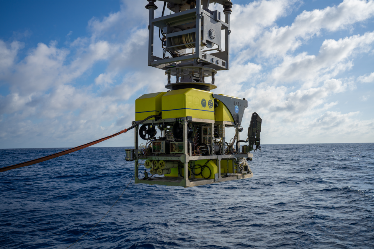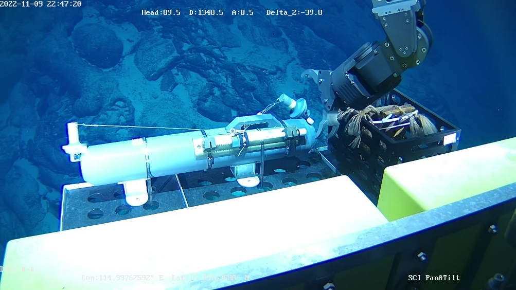 在本航次中,“探索二號”船通過光電復合鎧裝纜連接至中繼器,再通過非金屬輕質光電復合臍帶纜連接至ROV。中繼器與ROV組成柔性連接的分體式系統,該系統進行了4500米級海上試驗應用,有效驗證了“中繼器-ROV”的分體式布放-回收方案及測試流程,以及ROV各分系統及模塊的設計性能指標,并充分測試了ROV在4500m級大工作深度下的綜合作業能力,如定高、定深、定向、定速、樣品抓取收集等。