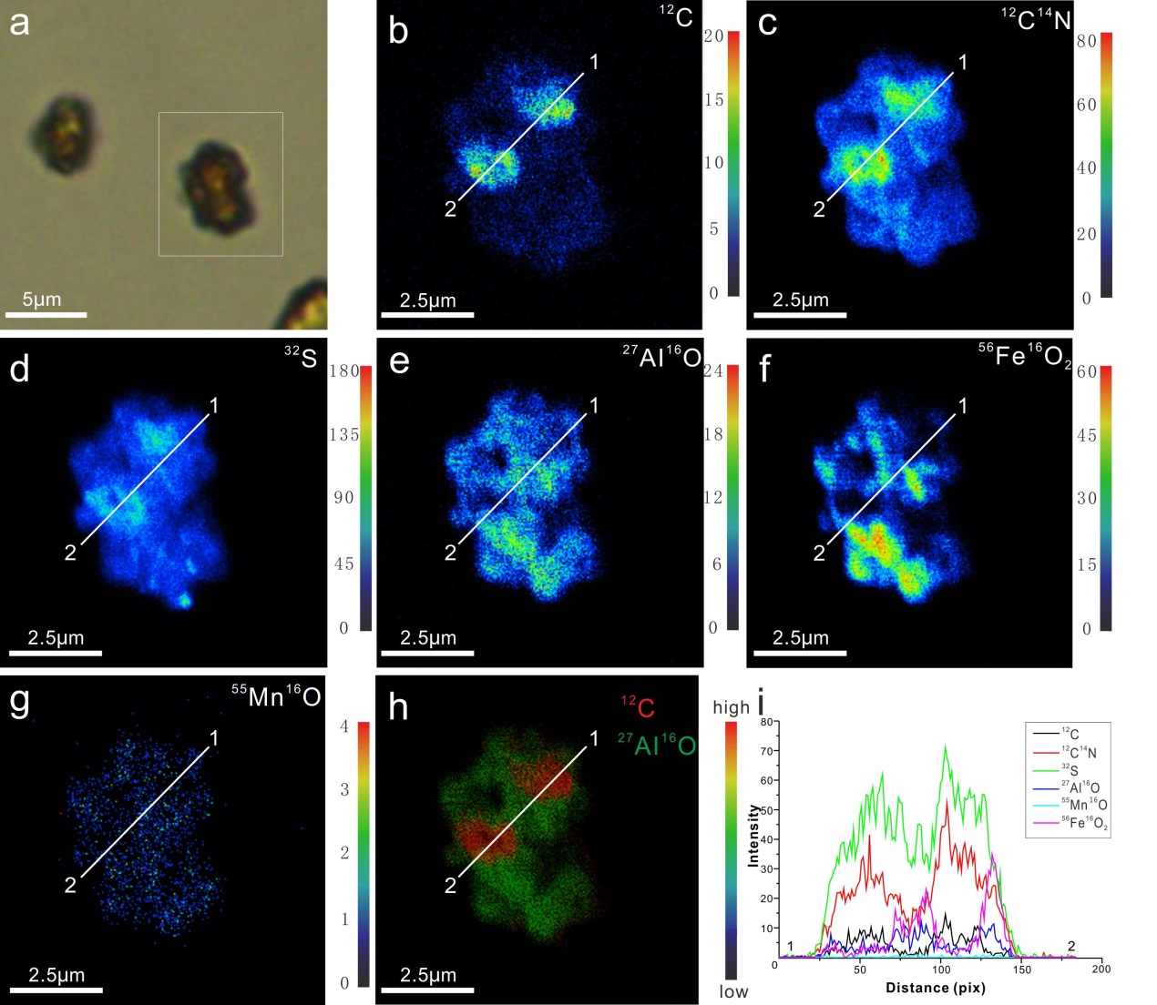 深海低溫?zé)嵋涵h(huán)境中礦化的微生物被綠脫石包裹,圖h:細(xì)菌(紅色),綠脫石(綠色)