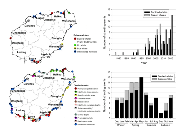我國南海生物多樣性水平高,海洋哺乳動物資源豐富。通過記錄和分析擱淺事件,可為海洋哺乳動物研究和保護提供重要的基線信息。深海所海洋哺乳動物研究團隊收集了近三十余年海南島沿岸鯨豚擱淺事件,記錄到4種須鯨的7次擱淺事件,10種齒鯨的105次擱淺事件。四種須鯨分別為布氏鯨、鳀鯨、鰛鯨和大翅鯨,須鯨擱淺記錄優(yōu)勢種為布氏鯨;齒鯨擱淺記錄的優(yōu)勢種為熱帶斑海豚、印太江豚和短肢領(lǐng)航鯨。時空分析結(jié)果表明:海南東海岸比西海岸鯨類擱淺記錄多;擱淺記錄在年際上呈現(xiàn)增長趨勢,在季節(jié)上呈現(xiàn)出春季(3?5月)高發(fā)的趨勢。基于以上結(jié)果,本研究討論了海南島鯨類擱淺歷史,并進一步提出了研究、保護和管理方面的相關(guān)建議。