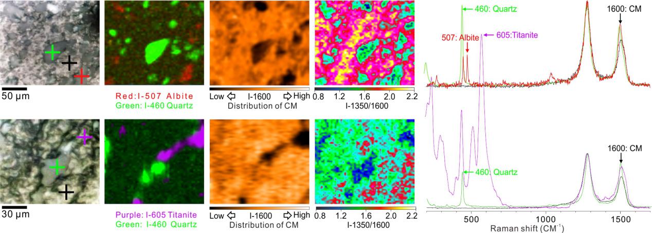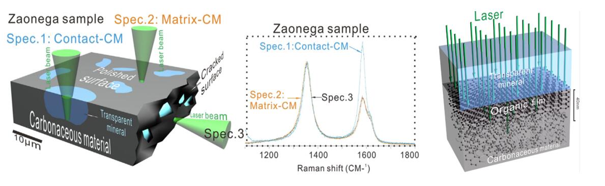 近日,地外海洋系統研究室屈原皋研究員及其團隊運用拉曼光譜學方法在古元古代(約20億年前)地層中發現熱液流體中有機分子以礦物為模板有序排列并在礦物表面組裝形成類似有機膜的結構。此過程中受溫度、壓強、礦物晶型、表面電荷等綜合因素影響,最終導致礦物表面有機膜的分子有序度不同。