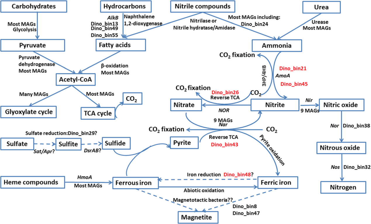 本研究從宏基因數據組裝出46個高質量的基因組,分別代表6個細菌門及1個古菌門?;蚪M的分析和比較結果指出這些基因組大部分都顯示是新的綱、目、科、屬或種且未曾成功被分離為純培養。相比包裹骨骼的泥巖樣品,骨骼富集了Nitriliruptoria, Deltaproteobacteria and Betaproteobacteria幾個綱里的基因組。對基因組功能基因的詮釋,揭示了多個物種可能參與碳、氮、硫和鐵的代謝。蛋白組學分析發現很多微生物基因已表達,相反,沒有發現內源性恐龍膠原蛋白肽。研究表明:出土的恐龍骨骼是微生物(包括新譜系)的棲息地;與外部沉積物相比,骨骼化石內部獨特的微生境和地球化學組分支持了較高的微生物生物量,也包含多組基因相互聯系的生物地球化學過程;這些微生物群落在中生代恐龍化石中的存在敦促科學家們在尋找殘存的內源性生物分子時,必須格外審慎。