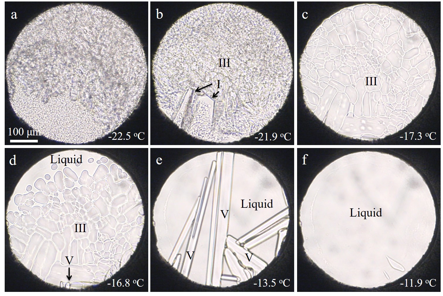 在論文中,研究人員設計了一種新型熱液金剛石壓腔(HDAC-VII)及其配套冷卻系統。相對于之前類型的壓腔,HDAC-VII具有更小的體積,方便開展激光拉曼、X射線吸收光譜和熒光光譜等原位分析,解決了冷卻實驗中窗口結霜等問題。其配套的冷卻系統可以使樣品腔冷卻到-170oC,測溫準確度為±0.5oC,最低冷卻速率為0.1oC/min。研究者應用HDAC-VII壓腔及冷卻系統,原位觀測到了I、IIIV號冰融化過程(如圖),及開展了鋰云母的結晶實驗研究,證明了實驗系統的穩定性和有效性。該類型壓腔的研發,擴大了HDAC的應用范圍,使之具備開展精細冷凍實驗的能力,方便測定不同流體體系的熱力學參數,以較大地促進地質流體科學的發展。