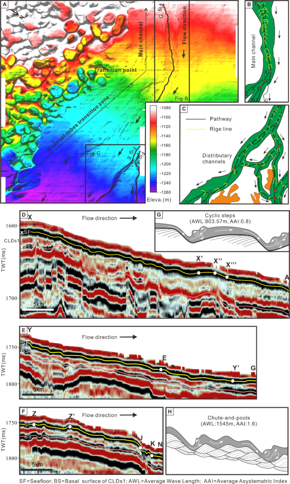 (一) 盡管前人通過水槽實驗和露頭測量已經(jīng)建立了濁流底形的理論演化模型,但是,水道-朵葉體轉(zhuǎn)換帶(the channel–lobe transition zones,簡稱CLTZ)內(nèi)的濁流底形演化很少有文獻記載,對其了解也非常少。以南海瓊東南盆地高分辨率三維人工地震資料為基礎(chǔ),采用地震沉積學與海底地貌學結(jié)合的分析方法,刻畫了水深1080-1260米、40公里長的現(xiàn)代海底濁流水系;推進了微地貌尺度的深水濁流底形觀測;在CLTZs內(nèi),更新了弗洛德數(shù)(Fr)整體下降趨勢下,局部超臨界流動和水力躍變的演化模型。