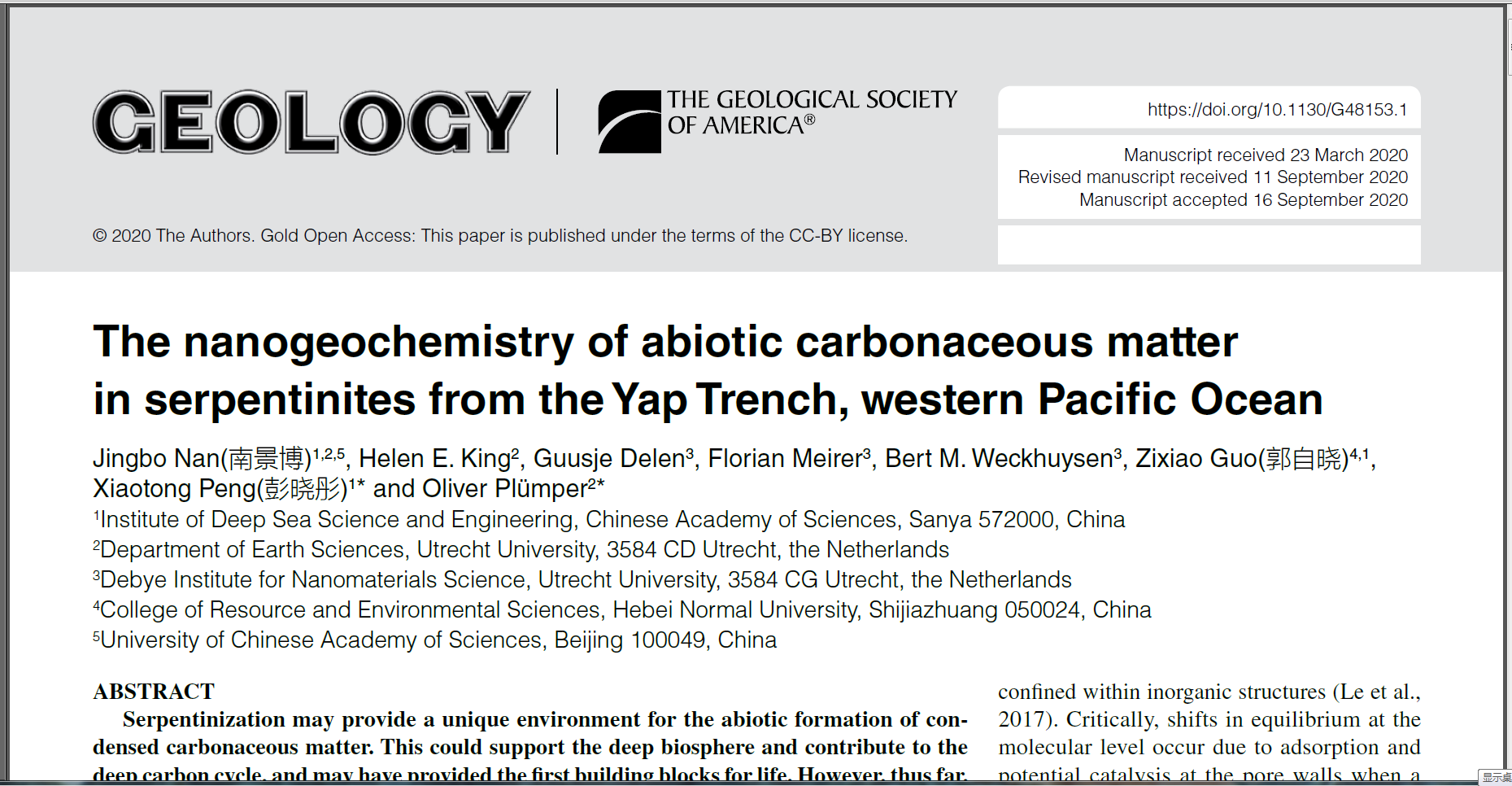 該項研究近期在線發(fā)表于地學(xué)權(quán)威期刊《Geology》,論文第一作者為深海所博士研究生南景博,彭曉彤研究員與烏得勒支大學(xué)Oliver Plümper博士為共同通訊作者(Nan, J., King, H.E., Delen, G., Meirer, F., Weckhuysen., B.M., Guo, Z., Peng, X.*, and Plümper, O.*, 2020. The nanogeochemistry of abiotic carbonaceous matter in serpentinites from the Yap Trench, western Pacific Ocean)。