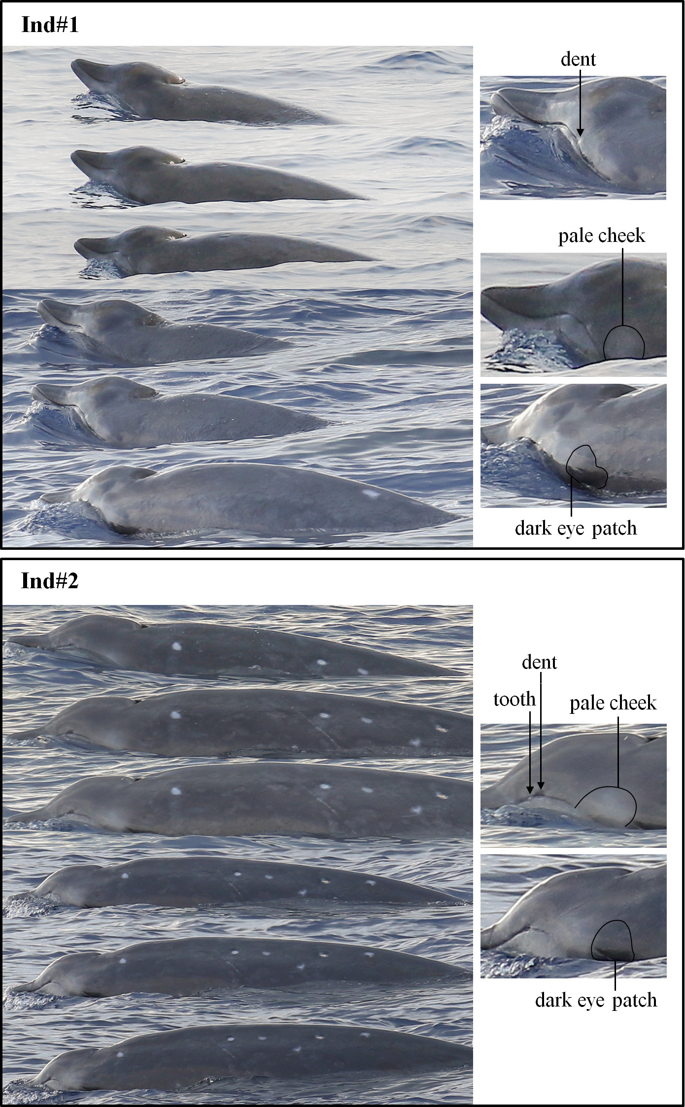 中科院深海所研究團隊在南海目擊到的三頭喙鯨體型相似,視覺上估計體長有4.55米。其中兩頭被拍攝到高清質量照片,分別記為ind#1ind#2。中等大小的鐮狀背鰭位于體長約三分之二處(見圖1);體表背部呈灰褐色;上顎呈褐色沒有白邊;下顎和臉頰呈蒼白色;有輕微的黑眼斑;上嘴唇拱形張口后有小凹痕;ind#2有突出的牙齒(見圖2)。兩頭動物體表都有達摩鯊咬痕,愈合的達摩鯊咬痕很少有白色愈合疤痕,大多數愈合疤痕與周圍皮膚的顏色相同(見圖3)。三頭喙鯨同步進行了三次連續潛水(淺潛),第四次為深潛,然后消失。呼吸頻率約為每分鐘10次。此外沒有觀察到其它水面行為。