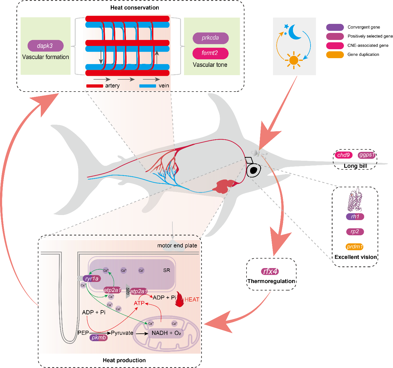 為了應(yīng)對(duì)水體快速散熱的特點(diǎn),水生恒溫動(dòng)物通常具有一個(gè)獨(dú)特的逆流交換器,用于溫度的保存和傳遞。劍魚和旗魚中存在著由動(dòng)脈和靜脈血管平行排列,血流方向完全相反的血管網(wǎng)絡(luò)系統(tǒng)。在對(duì)劍魚和旗魚的同源基因分析中,發(fā)現(xiàn)存在著9個(gè)顯著受到了正選擇的基因,其中有三個(gè)基因 (dapk3, prkcda和rfx4) 的存在較大的氨基酸改變。其中dapk3是脊椎動(dòng)物動(dòng)物平滑肌收縮調(diào)控的重要因子,該基因可能參與了血管網(wǎng)絡(luò)的形成;prkcda是調(diào)控血管張力的重要基因,該基因可能促進(jìn)了逆流交換器更好的實(shí)現(xiàn)熱量的保存和傳遞。而Rfx4高表達(dá)于哺乳動(dòng)物視交叉上核,對(duì)晝夜變化和溫度刺激具有調(diào)控作用。劍魚和旗魚中該基因的顯著改變表明視交叉上核可能對(duì)它們也具有關(guān)鍵的調(diào)節(jié)作用。