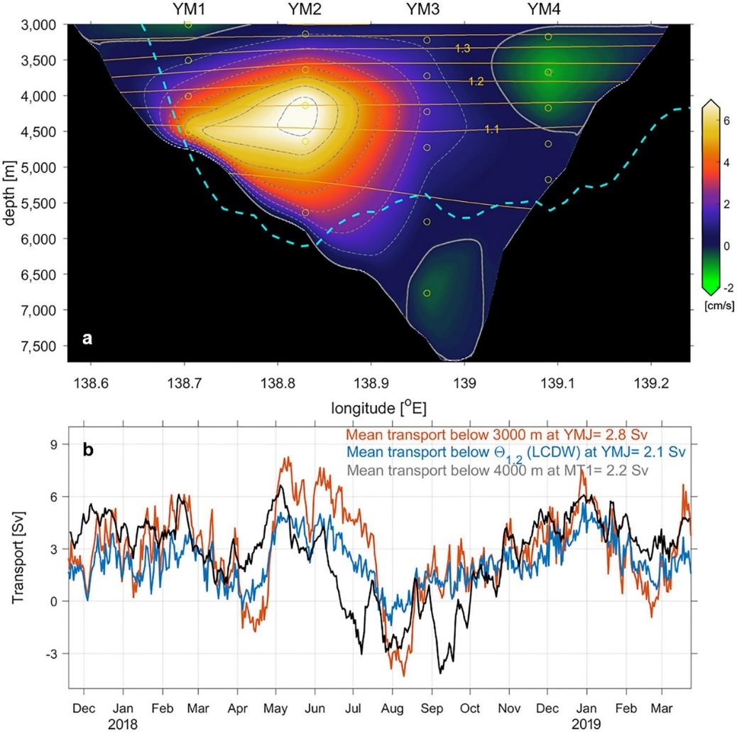 圖2 (a)是雅浦-馬里亞納連接處的經(jīng)向流速剖面和位勢溫度結(jié)構(gòu);(b)是深層水通量的逐日時間序列