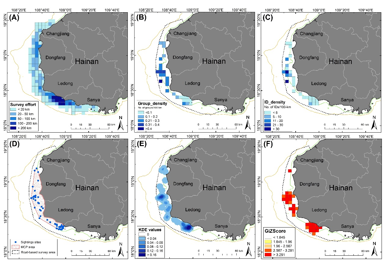經過全世界范圍內的鯨類科研人員幾十年的不斷發(fā)展和完善,漁民問卷調查、船基目視調查和被動聲學監(jiān)測都已逐漸成為非常重要的鯨類調查技術手段,而且被廣泛運用于各種類型的鯨類生態(tài)和保護研究項目。盡管如此,這些方法都有各自的使用條件、范圍、要求和局限性,這就導致單一方法所獲得的調查結果往往難以驗證其可靠程度。尤其應當注意的是,全球還有很多類似中國這樣的許多欠發(fā)達的國家/地區(qū),其共性是鯨類本底資料通常十分匱乏。此外,由于研究和保育資金支持非常有限,欠發(fā)達國家/地區(qū)的鯨類科研人員和保護工作者難以直接開展有針對性、大范圍、長期、系統(tǒng)的野外實地調查和監(jiān)測。深海所研究團隊首次將漁民問卷調查、船基目視調查和被動聲學監(jiān)測這三種技術方法組合,以海南中華白海豚的發(fā)現(xiàn)、驗證和長期監(jiān)測為示范,展示了中華白海豚在海南西南部的出沒分布及棲息地利用情況。相關的研究結果不僅為保護海南中華白海豚提供了基本的信息和資料,成為海南近海生態(tài)和珍稀動物保護的重要科學支撐,而且形成了一套循序漸進的、相互印證的、互相補充的整合式鯨類生態(tài)研究新范式,為全世界的鯨類科研人員提供了重要的示范參考,以便于在數(shù)據(jù)缺乏的水域更高效地開展鯨類生態(tài)和保護研究工作。