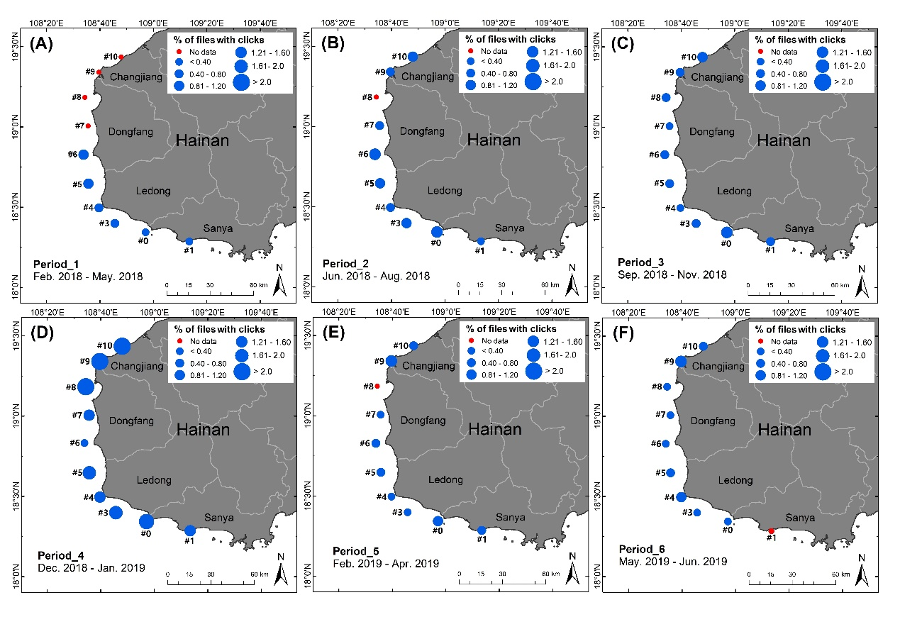 圖4. 海南西南近岸水域海豚clicks信號的被動聲學監(jiān)測情況(2018.2-2019.6被動聲學監(jiān)測結果)