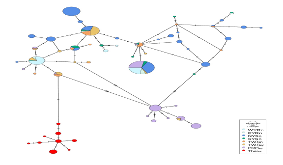 最小間距網(wǎng)狀圖(minimum spanning network)顯示生活在中國水域的江豚大多存在共享單倍型。但來自泰國灣的江豚卻形成了獨特的單系群,其與南海其它寬脊江豚種群之間的遺傳分化水平也高于迄今已知的大多數(shù)江豚種群間的分化水平。