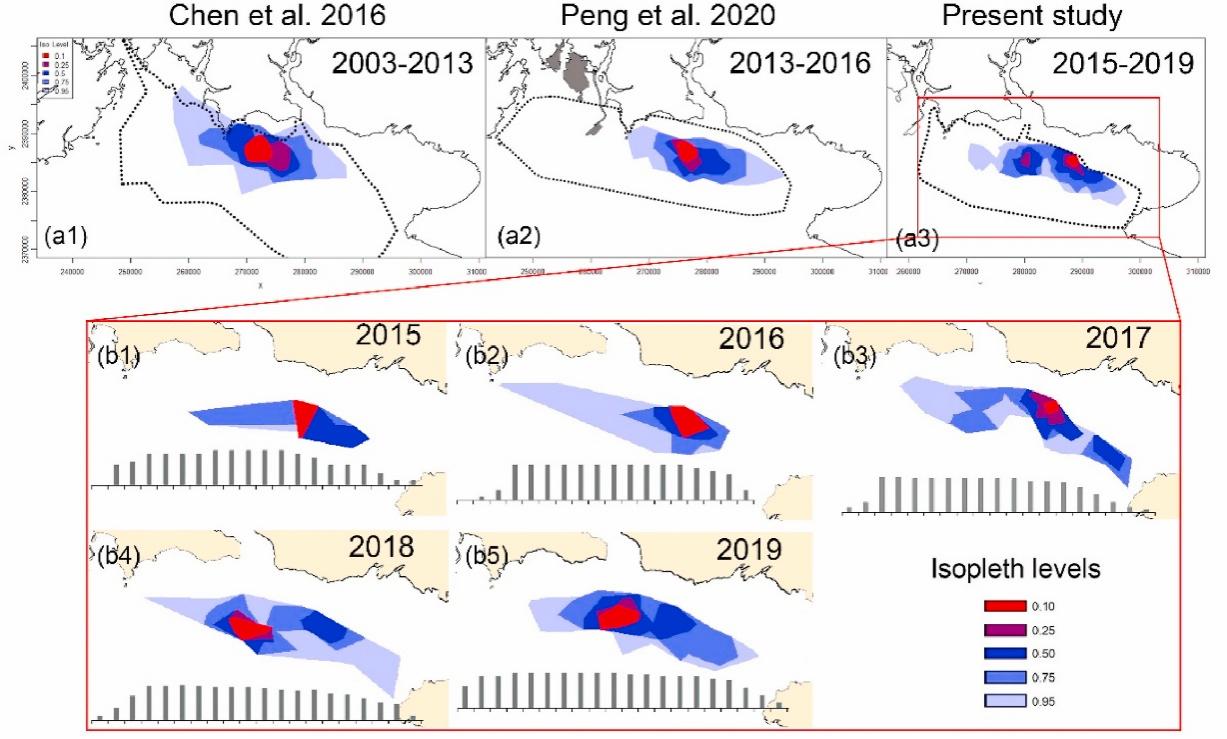 2022年12月20日,中科院深海所海洋哺乳動物研究團隊與汕頭大學研究團隊合作,在國際學術期刊Journal of Environmental Management發表題為《Ranging pattern development of a declining delphinid population: A potential cascade effect of vessel activities》的研究文章。該研究提取了北京大學、北部灣大學、廣西省科學院等團隊在北部灣大風江口水域(下稱該水域)的已發表目擊數據,并整合了深海所與汕頭大學2015年至2019年間系統調查結果,分析該海域中華白海豚空間分布的長期變化。研究結果顯示,該水域中華白海豚的活動范圍在本世紀初顯著減少。盡管海豚的整體活動范圍在近十年內較為穩定地集中在三娘灣至廉江灣一帶海域,但海豚的核心棲息地存在明顯的偏移。與早期空間分布模式相比,該海域的海豚核心棲息地在2015-2017年間從三娘灣沿岸東移至廉江灣外圍海域,而又在2018-2019年稍回落至三娘灣一側。