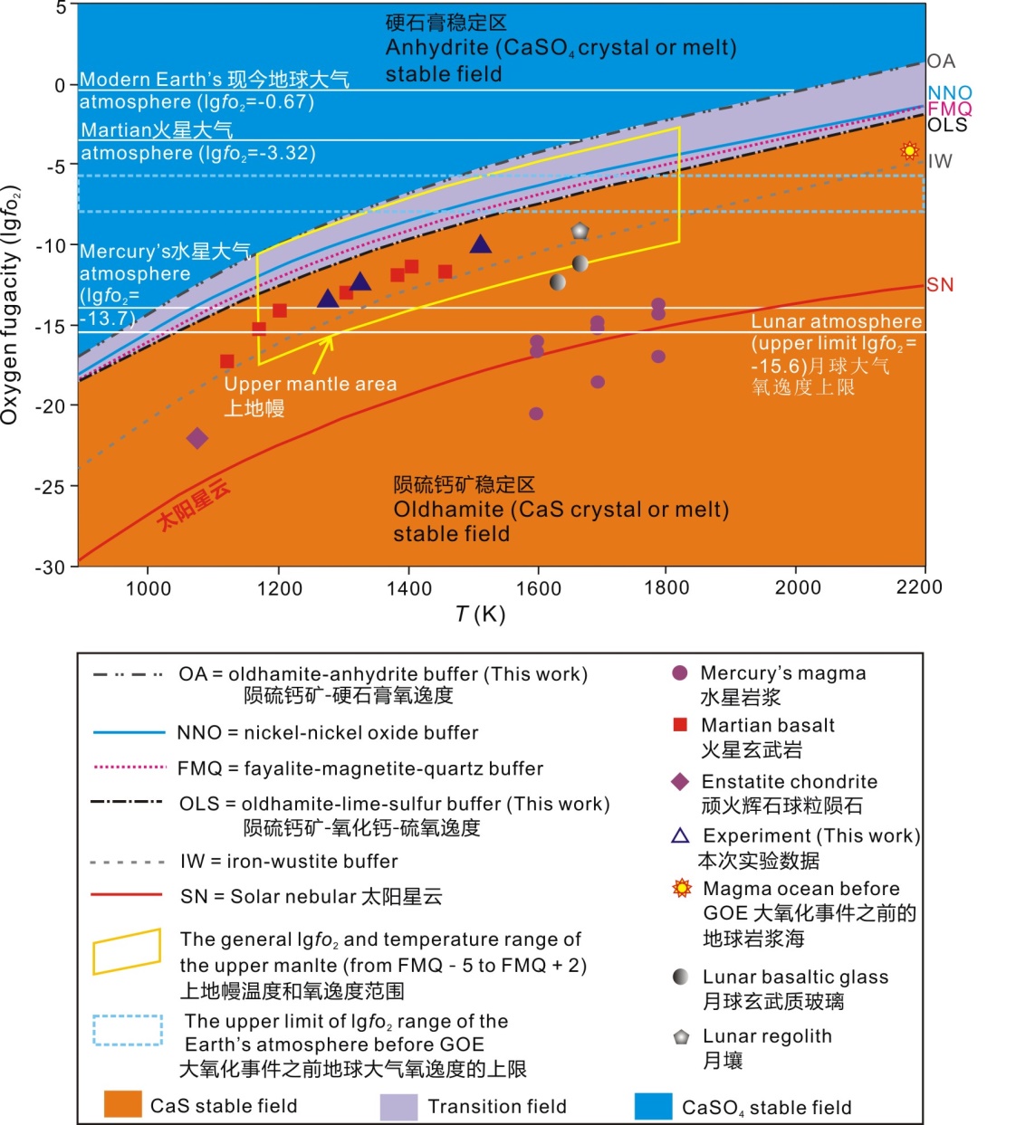 文章定義了2個氧逸度計:CaS-CaO-S平衡時的氧逸度(OLS氧逸度計)、CaS-CaSO4平衡時氧逸度(OA氧逸度計)。在0.5 GPa/1320 K, OA = FMQ + 2.21= IW + 6.05 (lgfo2 = –7.83), OLS = FMQ – 0.52 = IW + 3.30 (lgfo2 = –10.57),其本質上確定了S2-/S0平衡時和S2-/S6+平衡時的氧逸度,為行星硫循環(huán)和礦床學研究提供了重要的便利。巖漿低氧逸度、大氣極低氧含量、無大量液態(tài)水是CaS可在水星、月球表面較廣泛存在的3個條件,否則CaSO4將大量存在,如地球上和火星上表面大量的硫酸鈣或石膏。