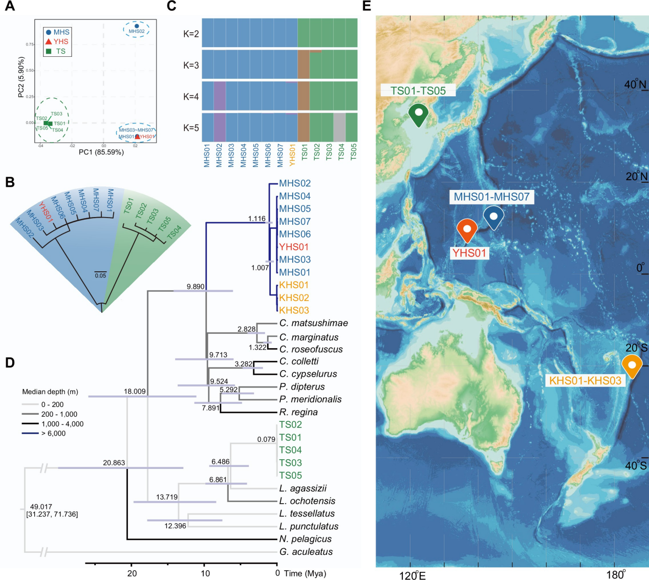 圖 1 深淵獅子魚的采樣信息、系統發育關系和種群結構