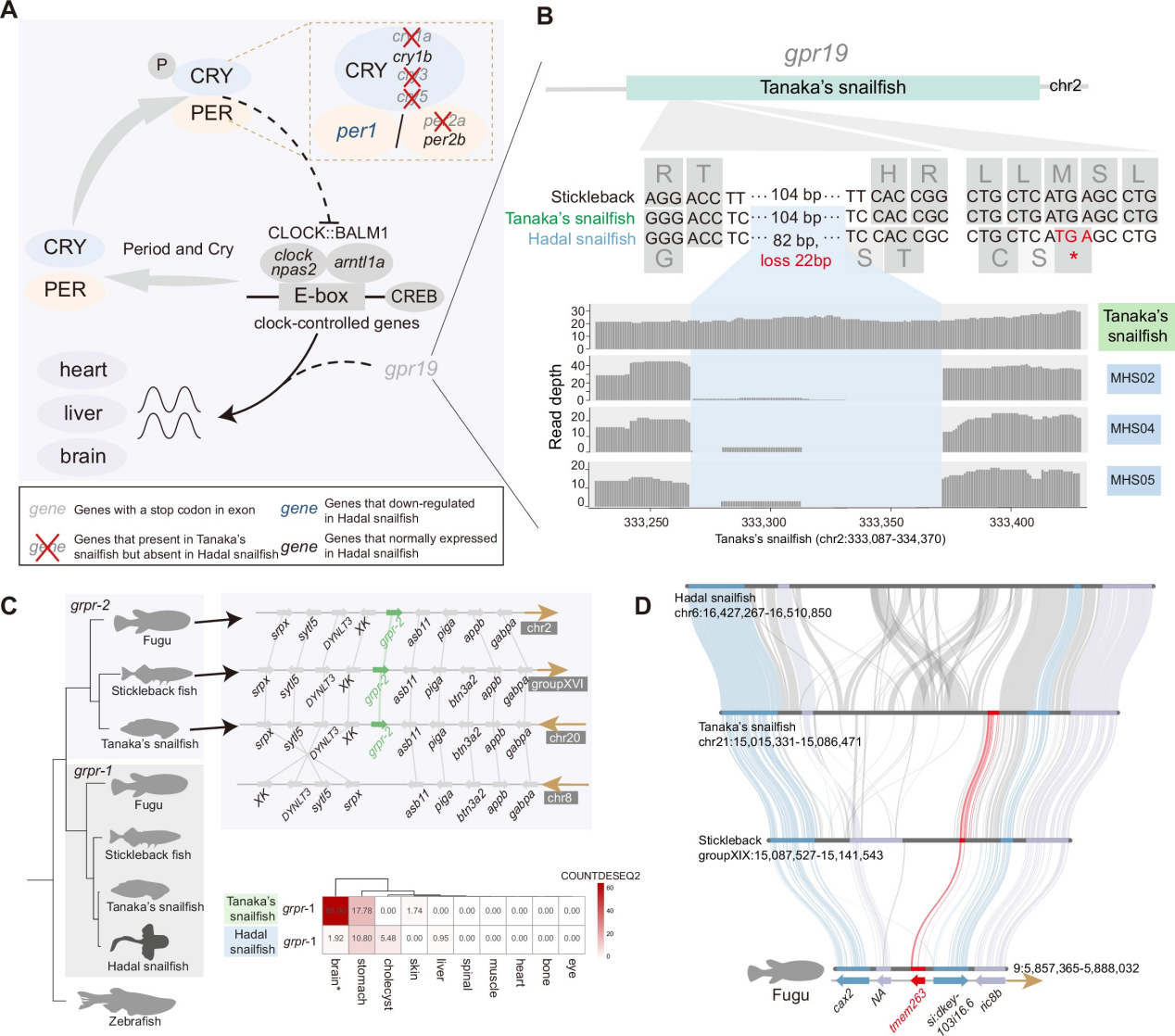 圖 3 深淵獅子魚基因組中節律相關基因的改變