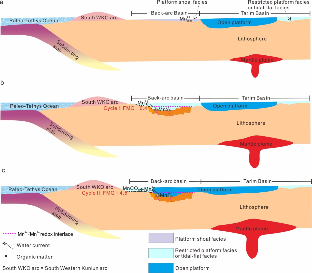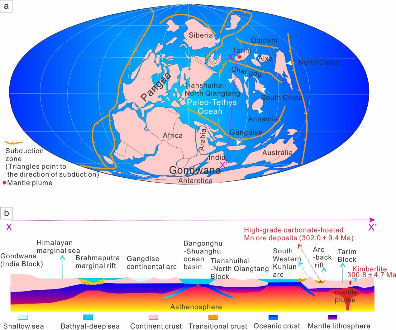 奧爾托喀訥什大型碳酸鹽型錳礦形成于古特斯洋向北俯沖的弧后盆地環(huán)境,本次工作通過(guò)新鮮錳礦石有機(jī)質(zhì)的Re-Os定年顯示其成礦時(shí)代為302 ± 9 Ma,是晚石炭世期間世界上第一個(gè)被發(fā)現(xiàn)的高品位菱錳礦礦床。該時(shí)期柴達(dá)木、華北板塊均存在古特斯洋向北俯沖的弧后盆地環(huán)境(圖2a),但卻未有菱錳礦床的發(fā)現(xiàn)。研究推測(cè):塔里木地幔柱的活動(dòng)促進(jìn)了西昆侖菱錳礦礦床的形成(圖2a)。原因在于:(1)錳礦成礦時(shí)代與其北部塔里木地幔柱啟動(dòng)時(shí)間一致(塔里木金伯利巖年齡300.5 ± 4.4 Ma被認(rèn)為是地幔柱啟動(dòng)時(shí)間(Zhang et al., 2013)(圖2b);(2)Re-Os同位素顯示礦區(qū)有地幔物質(zhì)參與;(3)西昆侖北部存在塔里木地幔柱,西昆侖南部的北羌塘地體(圖2a)在早二疊紀(jì)也有地幔柱活動(dòng)(Zhang and Zhang, 2017), 故夾在中間的西昆侖地區(qū)也應(yīng)受到地幔柱的影響。礦區(qū)存在強(qiáng)烈的熱水沉積活動(dòng),可能地幔柱影響下的弧后盆地的熱水活動(dòng),提供了錳源。