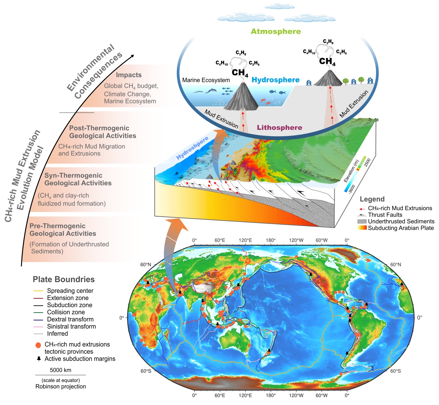 近日,中國科學院深海科學與工程研究所海洋地球物理與資源實驗室的吳時國研究員指導的博士生Umair Khan與北京科技大學的合作者在期刊《Geoscience Frontiers》上發表了一篇題為《Geochemical Cycling, Tectonic Drivers and Environmental Impacts of CH4-Rich Mud Extrusions in Subduction Zones》的論文。